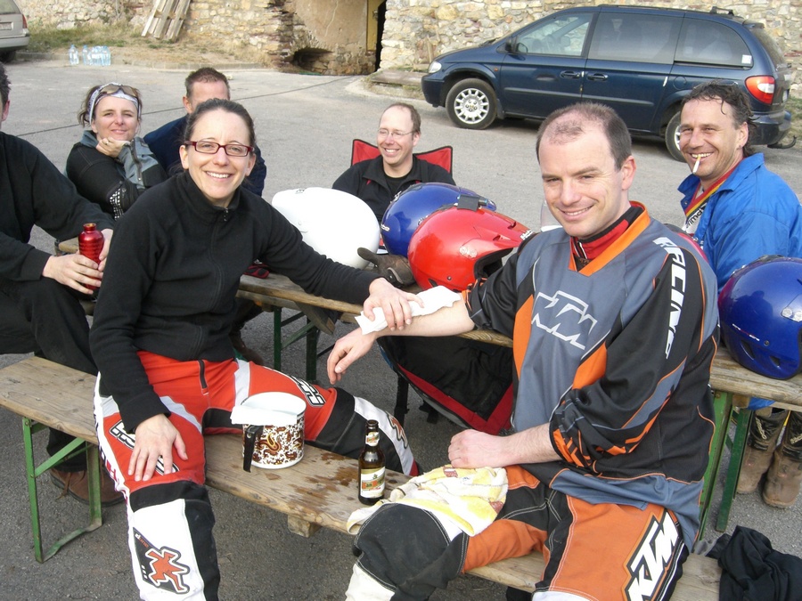 Nach einer Woche hatte der Miche mit einem harten Rücken, Tammo mit einem harten Arm und Oliver mit der harten Erkenntnis zu kämpfen, dass Trialieren echt schwierig ist. Lakonischer Kommentar von Meister Kurt: Oliver, so wie Du Dich anstellst ist es echt erstaunlich, dass Du auf der Rennstrecke so schnell bist...